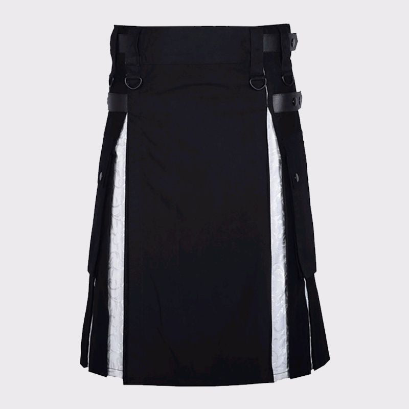Elevate your style with the Black and White Brocade Pleats Hybrid Kilt, a custom-made unisex garment that combines timeless elegance with modern functionality. Order today for a truly unique and stylish addition to your wardrobe!