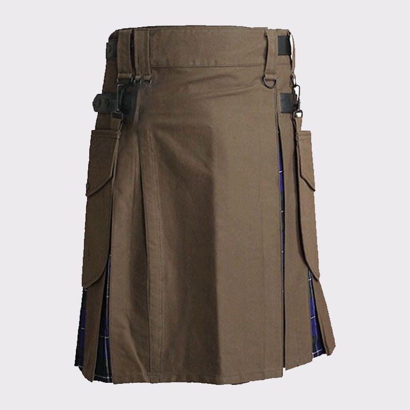 The Brown Hybrid Kilt with Tartan combines the timeless appeal of classic tartan patterns with the versatility and practicality of a modern hybrid utility kilt. This unique design blends rich brown tones with tartan accents, offering a stylish and functional option for those seeking both heritage and contemporary flair. Perfect for various occasions, from Highland events to casual outings, this kilt stands out as a bold yet sophisticated choice.