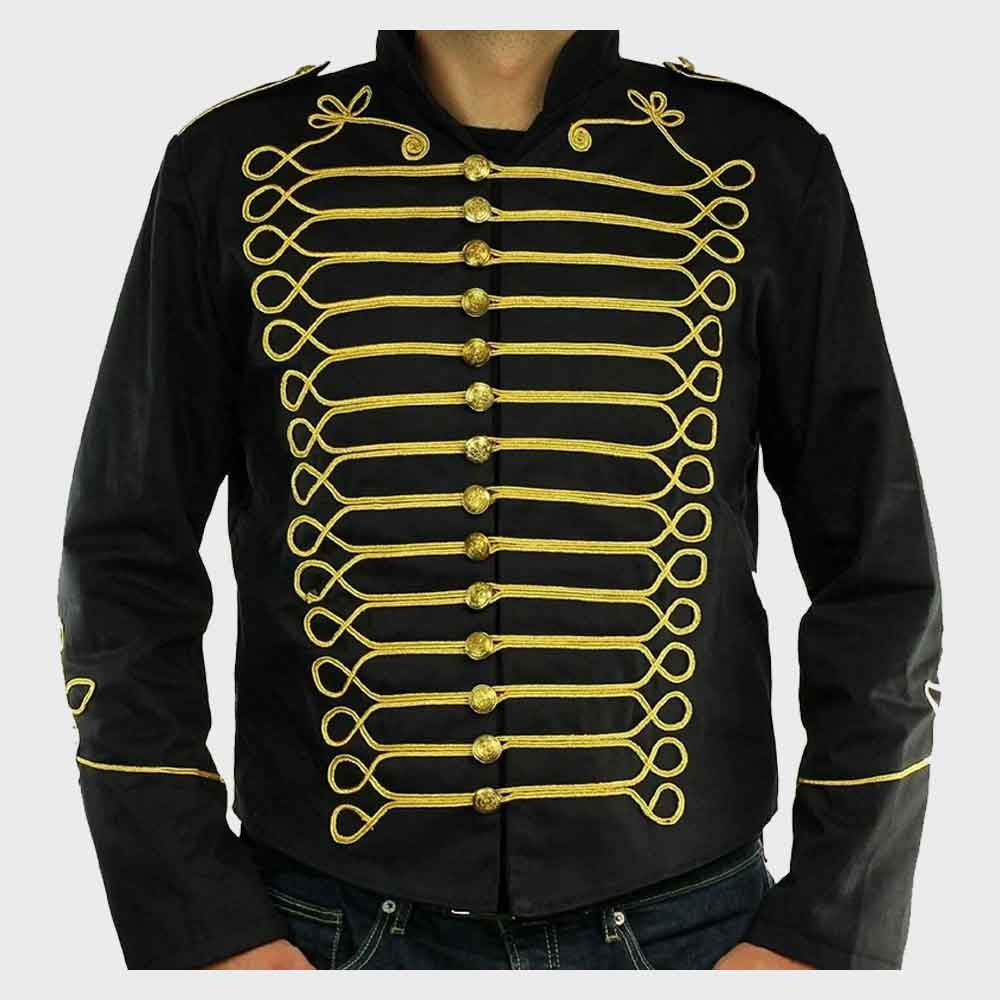The Mens Unique Modern Gold Embroidery Black Military Napoleon Jacket combines timeless military elegance with contemporary fashion. This jacket is a bold statement piece, ideal for formal events, reenactments, or those looking to showcase a distinguished style.